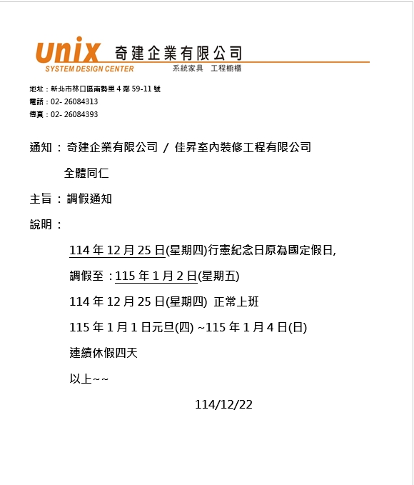 【休假調整】原114年12/25(四)休假【改】上班。連假:115年1月1(四)~4(日)日